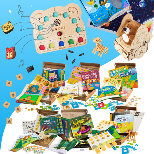 Want it all? This Learn with Mochi bundle includes a Robotics Kit and the entire library of Mochi's coding adventures - Planets, Colors, Numbers, Letters, Shapes, Animals, Words, Fruits and Vegables, Earth, Time, Biology, Good Habits, Computer Science, Neuroscience of Sleep, Dinosaurs, and Insects & Bugs. Your course on computational thinking all in one complete kit.