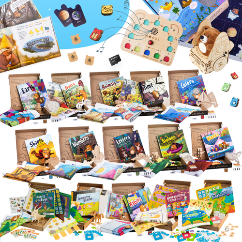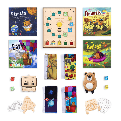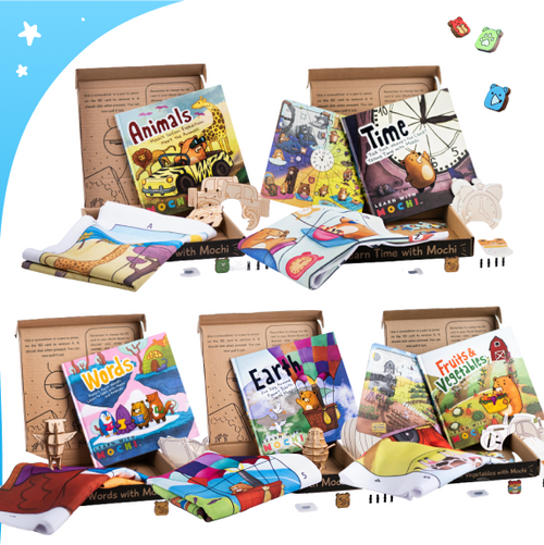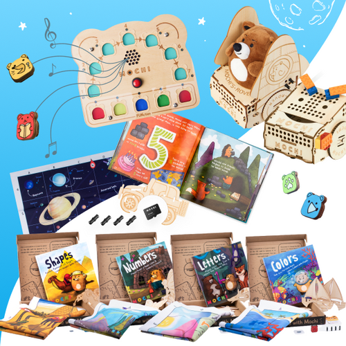 Complete your Mochi adventure book collection. This bundle includes - Animals, Words, Fruits & Vegetables, Earth, and Time. Mochi Robotics Kit not included.